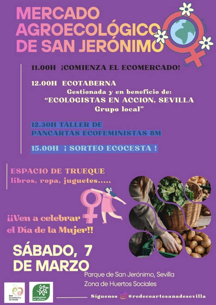 Mercado agroecológico de San Jerónimo — ECOTABERNA Gestionada y en beneficio de: «ECOLOGISTAS EN ACCION, SEVILLA Grupo local» — TALLER DE PANCARTAS ECOFEMINISTAS 8M — SORTEO ECOCESTA