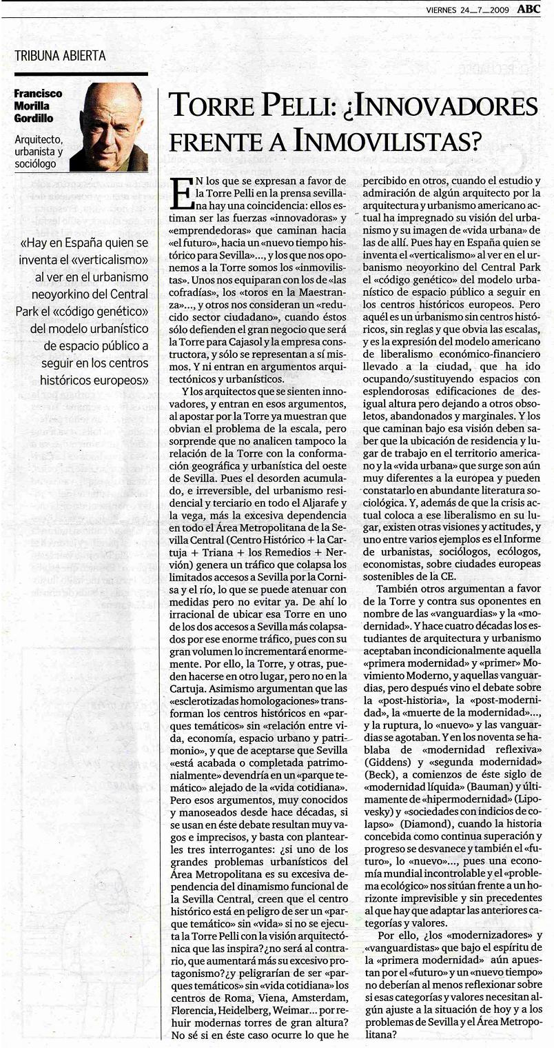 Por su parte, Víctor Fernández Salinas, Profesor de Geografía de la Universidad de Sevilla y miembro de la Comisión Internacional de Monumentos y Sitios (Icomos-España) afirmó que Sevilla, apostando por los rascacielos "podría parecerse más a Benidorm que a Nueva York, ya que construir en vertical no es símbolo de modernidad".