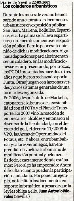 Ya hemos denunciado en diversas ocasiones la burla que ésto significa para la participación ciudadana. Pero lo peor es el contenido de dichas modificaciones. Algunas Adaptaciones Parciales intentan ser un coladero. En las Modificaciones se están presentando, por trozos, los PGOU´s presentados hace dos ó tres años y que fueron rechazados por la Junta. Otras juegan con las zonas verdes y otros sistemas generales de una forma desvergonzada.