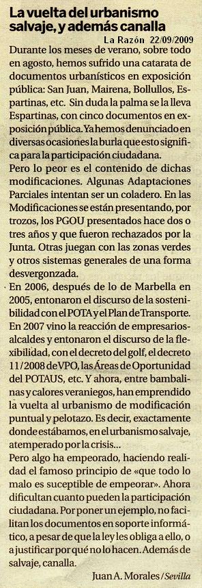En 2006, después de lo de Marbella en 2005, entonaron el discurso de la sostenibilidad con el POTA y el Plan de Transporte. En 2007 vino la reacción de empresarios-alcaldes y entonaron el discurso de la flexibilidad, con el decreto del golf, el decreto 11/2008 de VPO, las Áreas de Oportunidad del POTAUS, etc. Y ahora, entre bambalinas y calores veraniegos, han emprendido la vuelta al urbanismo de modificación puntual y pelotazo. Es decir, exactamente donde estábamos: En el urbanismo salvaje, atemperado por la crisis...