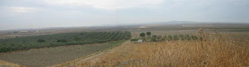 Vista de los Campos de Gerena desde el mirador situado en la base del Cerro. Al fondo la Cornisa Norte del Aljarafe.