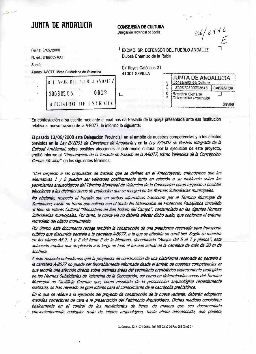 En el escrito, de fecha 03/09/08, remitido por la Delegación Provincial de Cultura al Defensor del Pueblo Andaluz, tras haber realizado éste hasta tres peticiones de información al respecto del desdoble del actual trazado de la A-8077 contemplado en el anteproyecto de la variante Valencina-Camas, se recoge lo siguiente referente al informe emitido el 13 de junio de 2008: